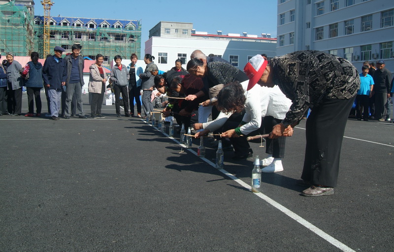 离退休职工正在进行趣味体育“吊瓶”比赛